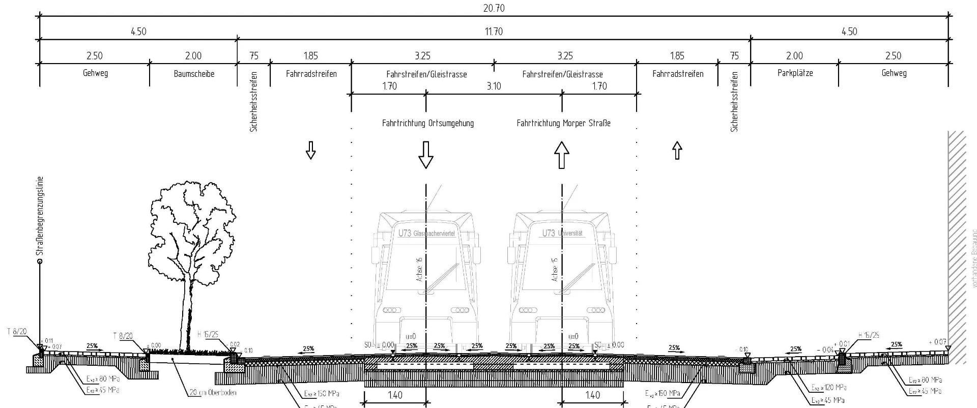 Die Ortsumgehung befindet sich überwiegend im Bereich der gegenwärtigen Brachfläche. Die neue Straße umfasst 2 Fahrbahnen und eine in Mittellage geführte Stadtbahntrasse. Beidseitig der Fahrbahnen werden Geh- und Radwege angelegt. Der südliche Radweg wird als Radschnellweg ausgebaut.