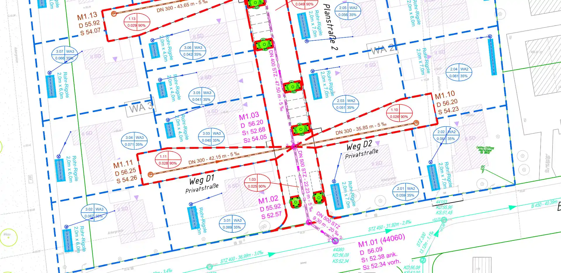 Bei der weiteren Erarbeitung der Erschließungsplanung wurde in Abstimmung mit den StEB Köln, AöR und Amt 66/67 der Stadt Köln der DWA-Themenband “Praxisleitfaden zur Überflutungsvorsorge” – Starkregen und urbane Sturzfluten berücksichtigt und entsprechend eingearbeitet.
